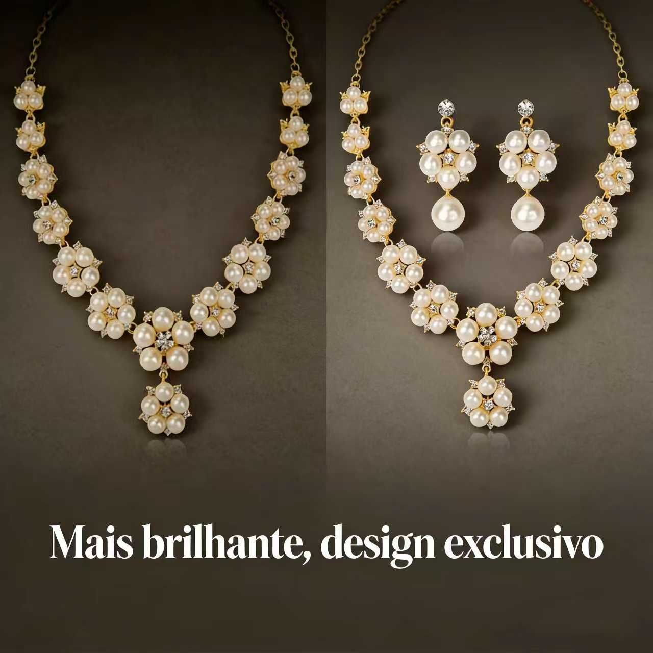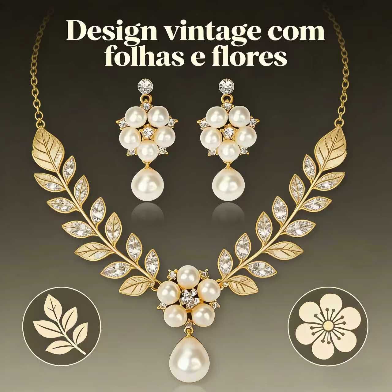 Conjunto de Colar e Brincos (Pérola Falsa + Zirconia) – Estilo Vintage Folha Flor, Ideal para Noivas, Festas e Dia a Dia