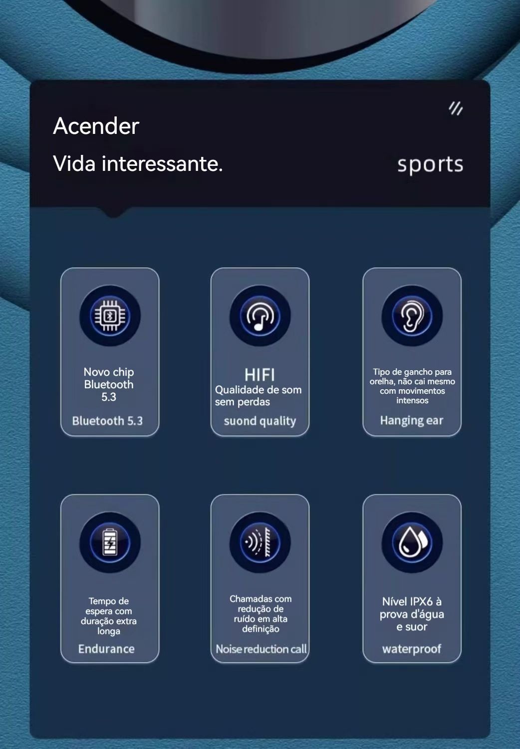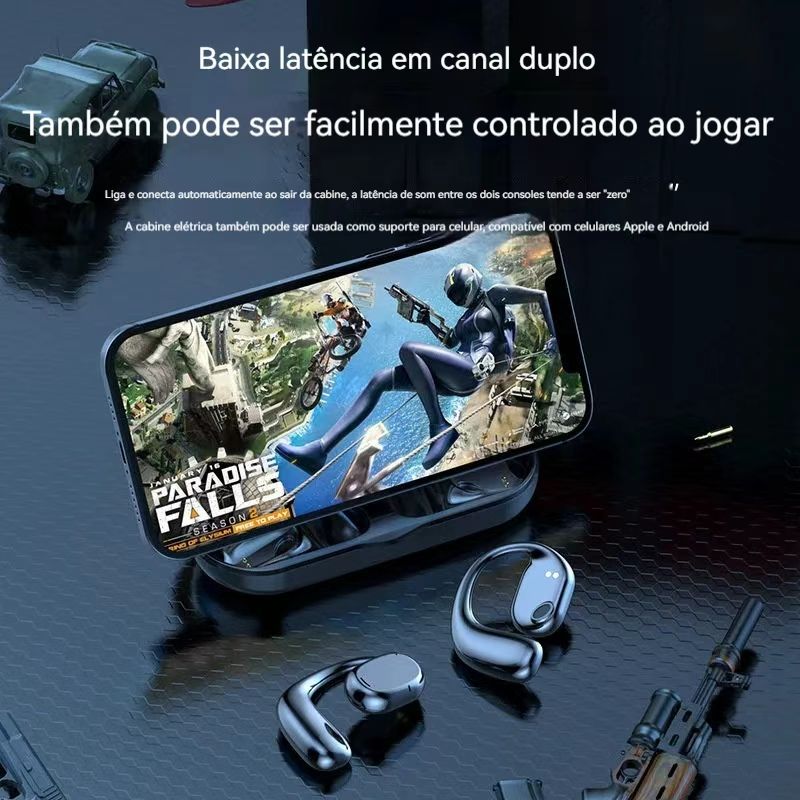 Novo fone de ouvido Bluetooth de dois canais para uso em negócios e esportes, com design para encaixar nas orelhas, longa duração da bateria e modelo exclusivo, compatível com diversos dispositivos.