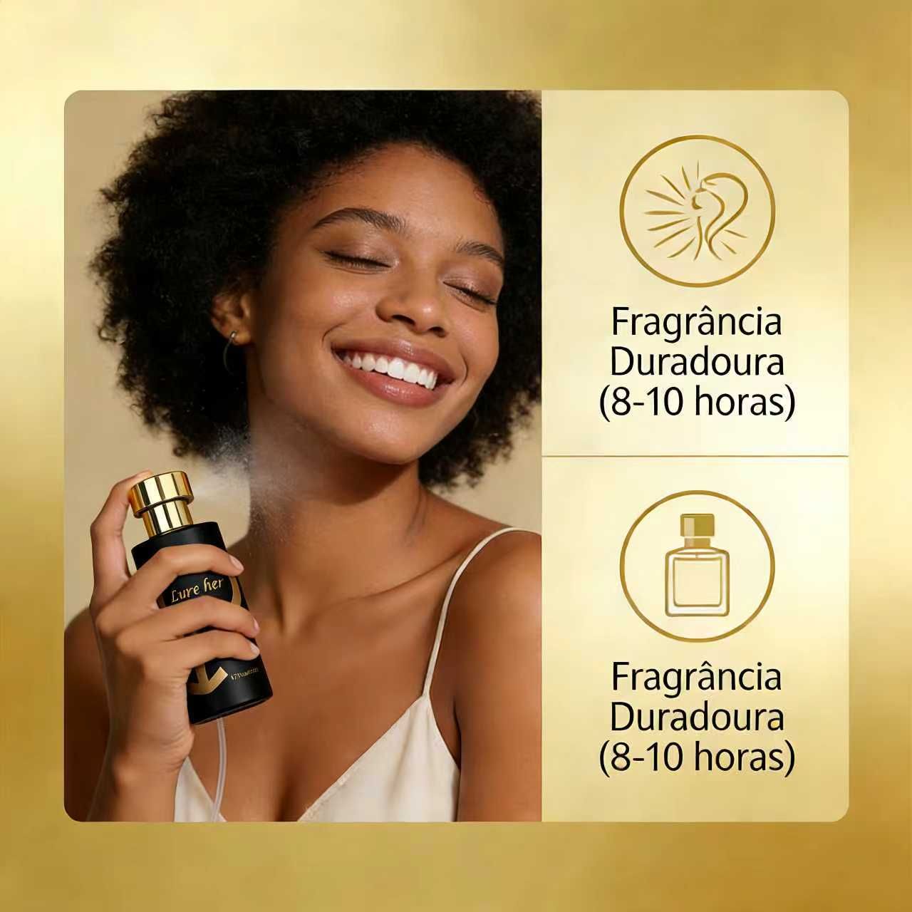 LURE HER (garrafa preta): Notas de frutas e flores frescas — aroma suave, feminino e charmoso (perfeito para datas, saídas com amigas ou dia a dia).