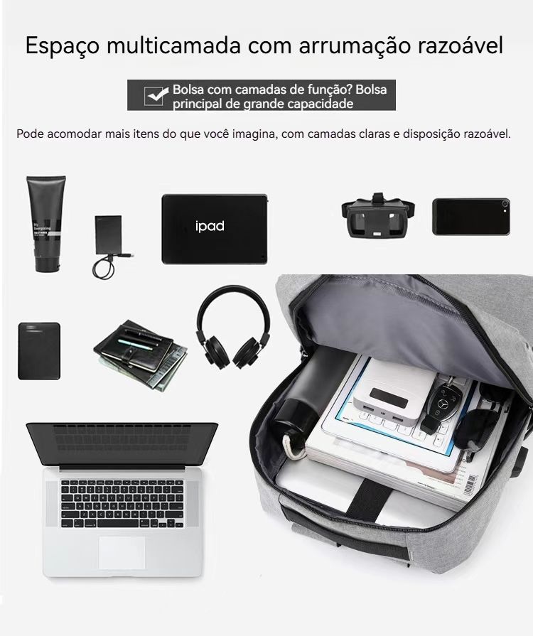 ✅ Carregador USB Integrado:Carrega o celular enquanto usa a mochila (prático para quem anda muito!).