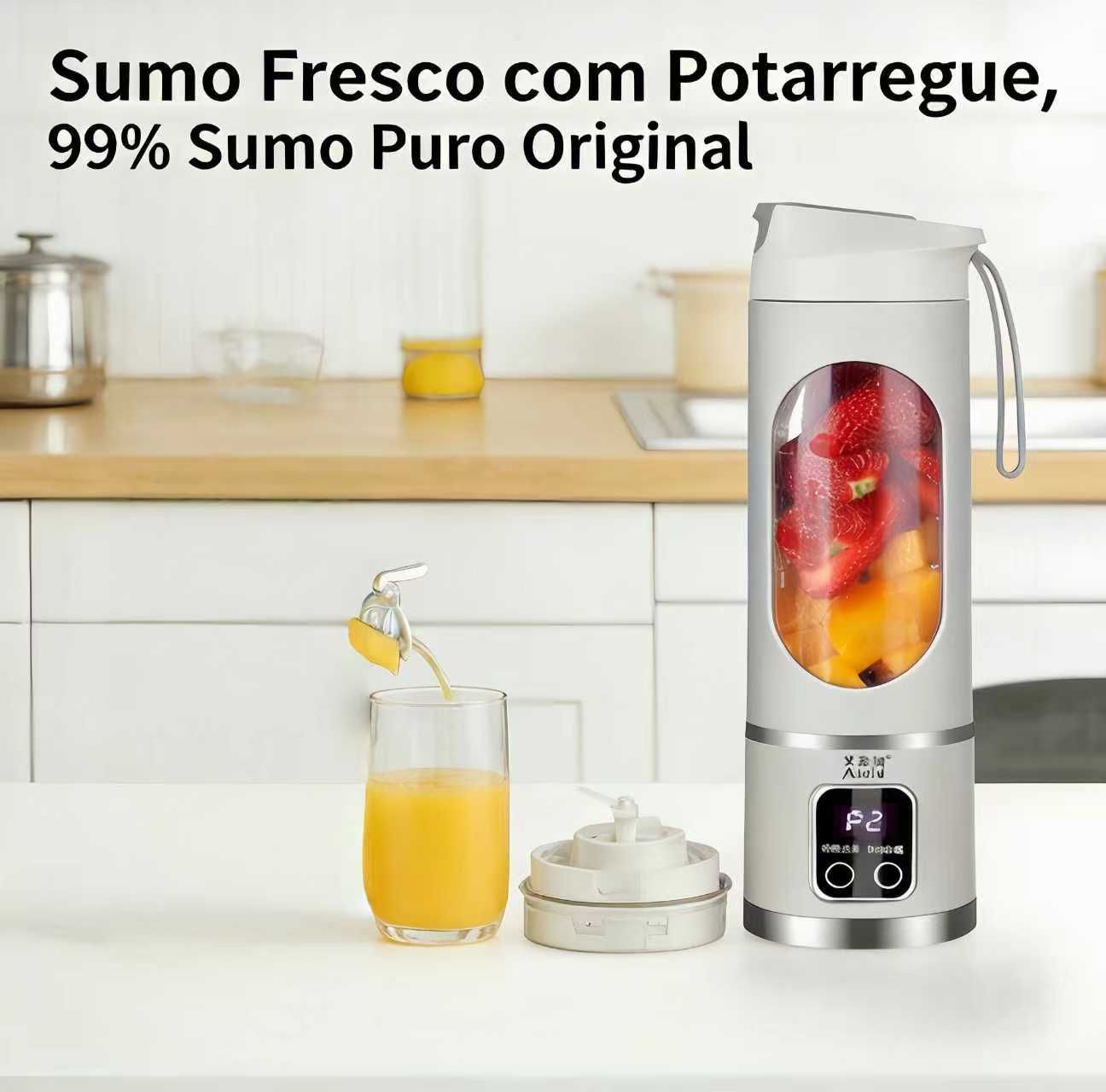 Bateria duradoura: Carrega 1 vez, serve pra fazer até 8 copos de sumo — não precisa ficar ligado na tomada o tempo todo.