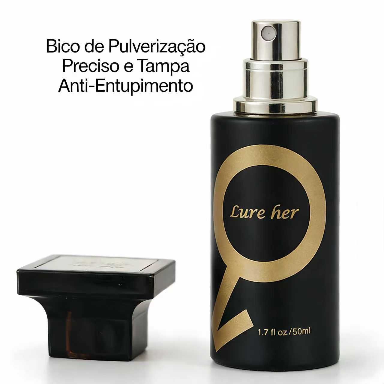 LURE HER (garrafa preta): Notas de frutas e flores frescas — aroma suave, feminino e charmoso (perfeito para datas, saídas com amigas ou dia a dia).